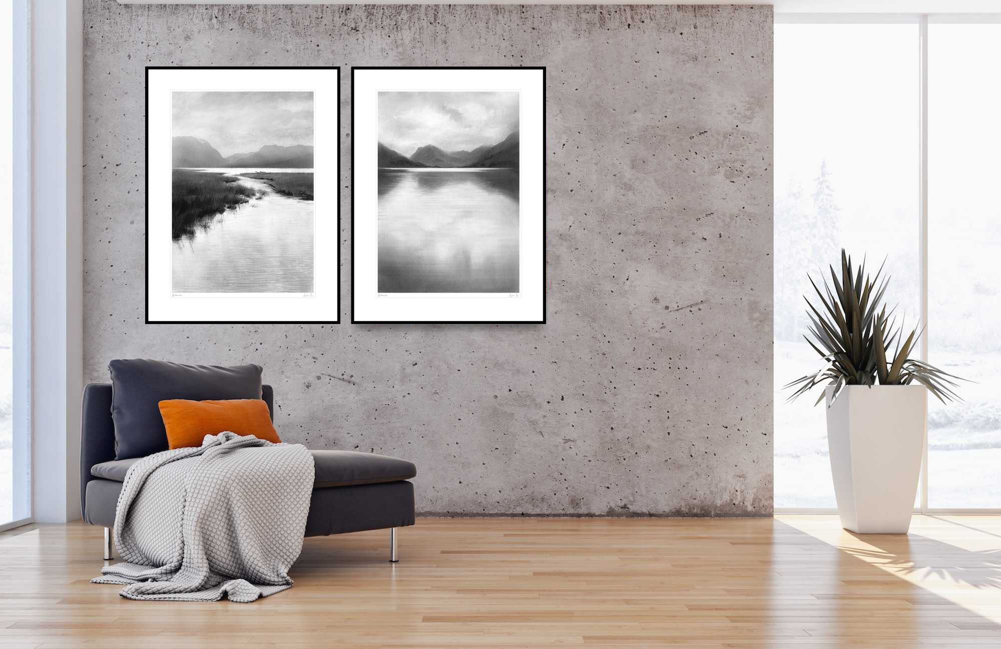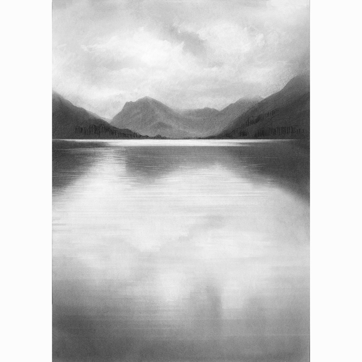 Image of Buttermere in the Lake District. This works as a diptych with the adjacent image, opposing views across the lake. I imagine these hung to face each other as the views do in reality, but they work side by side too.